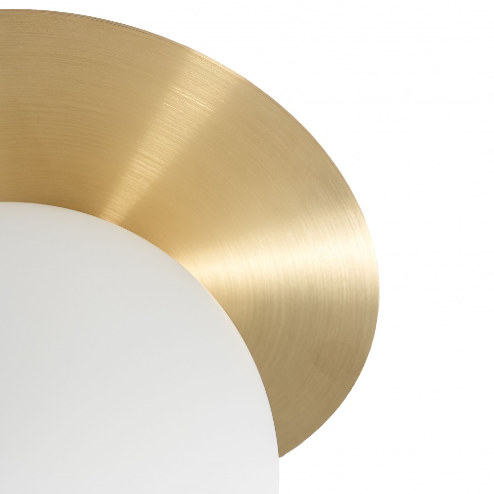 - Mlecznobiały klosz ze szkła (⌀15 cm) na tle mosiężnego dysku (⌀20 cm).