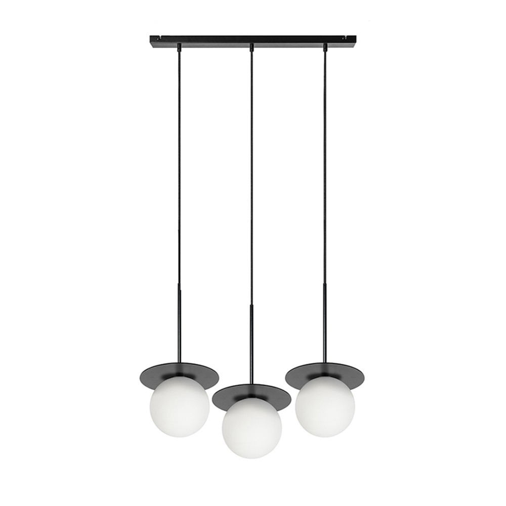 • potrójna lampa wisząca na listwie • kolor czarny (Jet Black RAL 9005) • materiał wykonania metal, szkło • długość 60cm • szerokość 20cm • wysokość 43cm • długość całkowita 130cm • 3x mlecznobiały szklany klosz ⌀15cm • czarna listwa 60cm • 3x dysk ⌀20cm • 3x przewód w oplocie, czarnym, poliestrowym • gwint G9 • max 3x12W LED • IP20