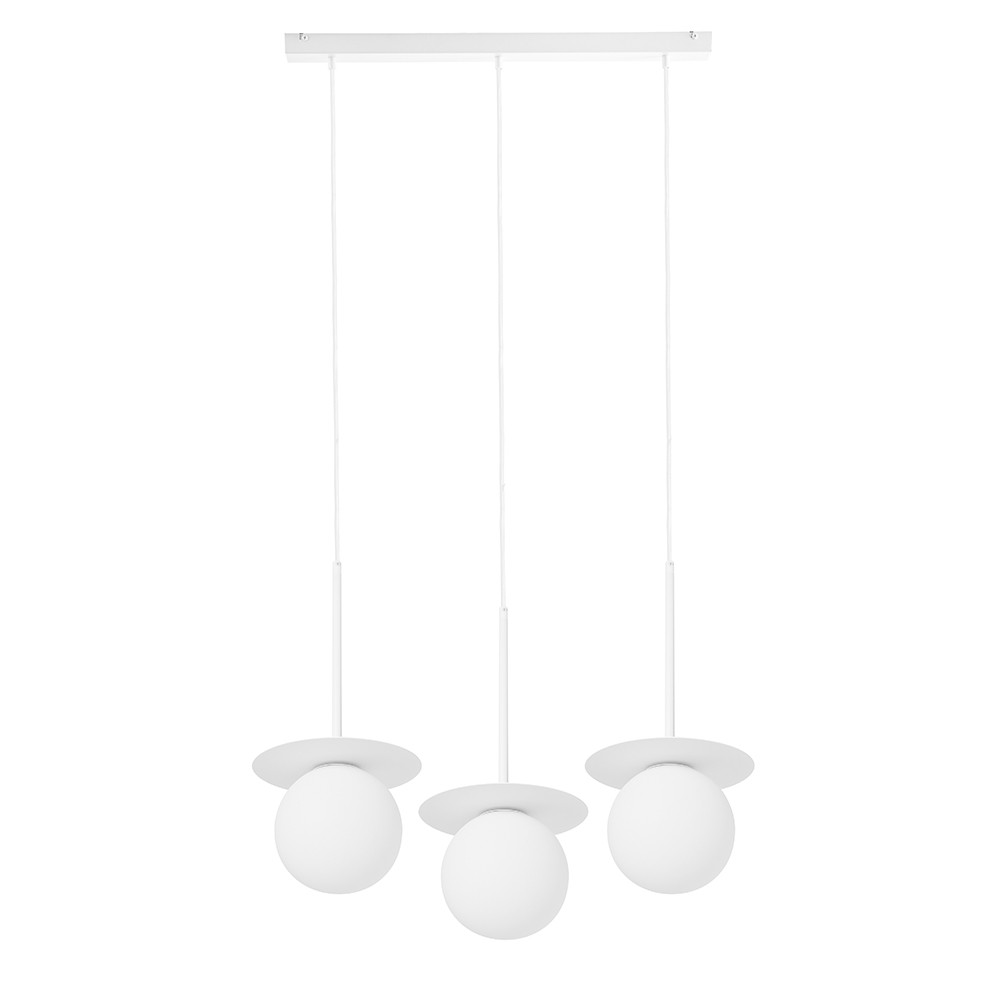 • potrójna lampa wisząca na listwie • kolor biały (Signal White RAL 9003) • materiał wykonania metal, szkło • długość 60cm • szerokość 20cm • wysokość 43cm • długość całkowita 130cm • 3x mlecznobiały szklany klosz ⌀15cm • biała listwa 60cm • 3x dysk ⌀20cm • 3x przewód w oplocie, białym, poliestrowym • gwint G9 • max 3x12W LED • IP20