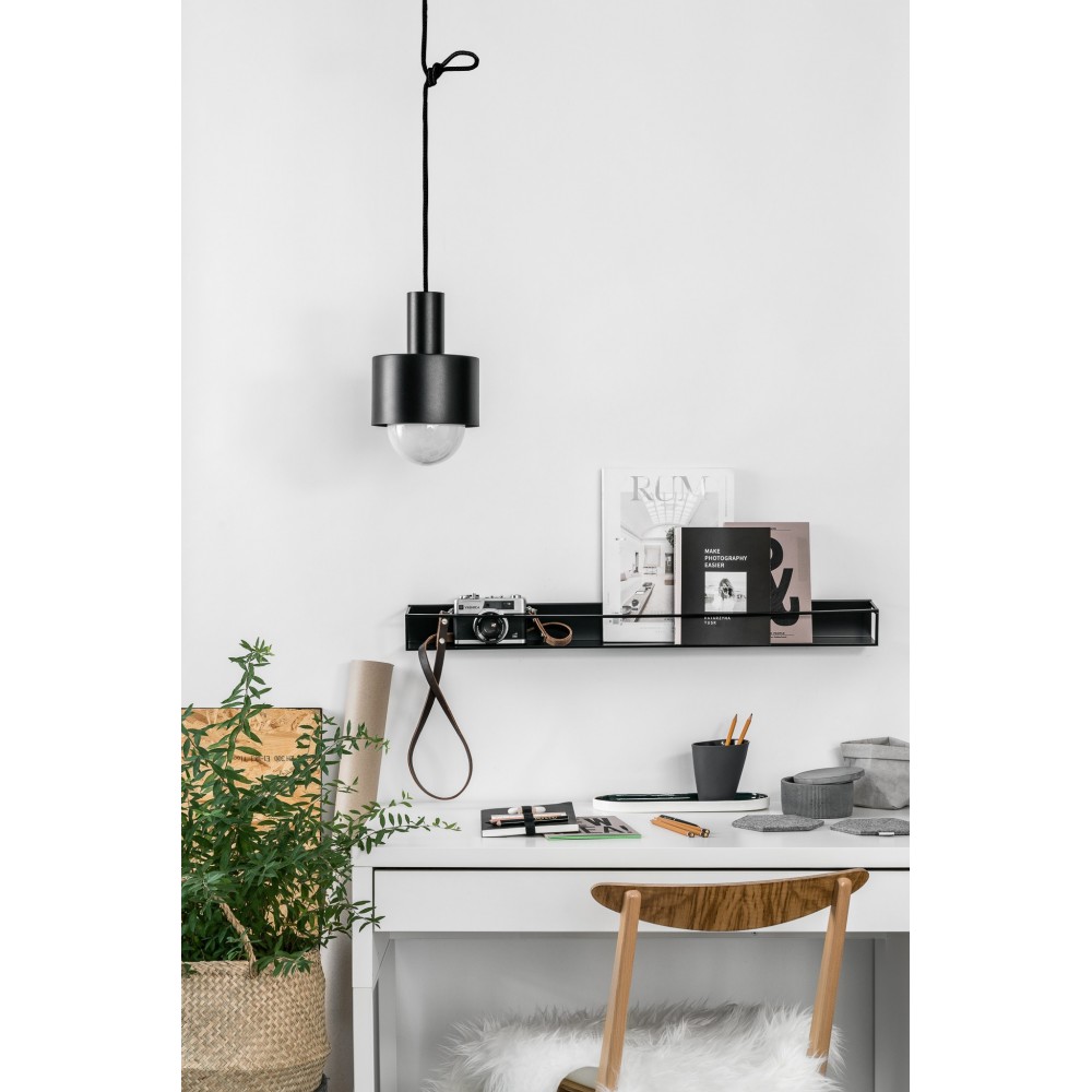 Lampa wyposażona jest w czarny przewód w oplocie tekstylnym o długości 107,5 cm, który umożliwia swobodną regulację wysokości zawieszenia – od krótkiego, funkcjonalnego zwisu po bardziej efektowną formę zawieszoną nisko nad powierzchnią. Forma klosza została zaprojektowana tak, by dostosować się do różnego rodzaju źródeł światła. Standardowa żarówka A60 pozostaje ukryta, tworząc spójną, zamkniętą bryłę, natomiast większa – np. dekoracyjna o średnicy 125 mm – wychodzi poza jego obrys, całkowicie zmieniając charakter lampy i dodając jej designerskiego sznytu.