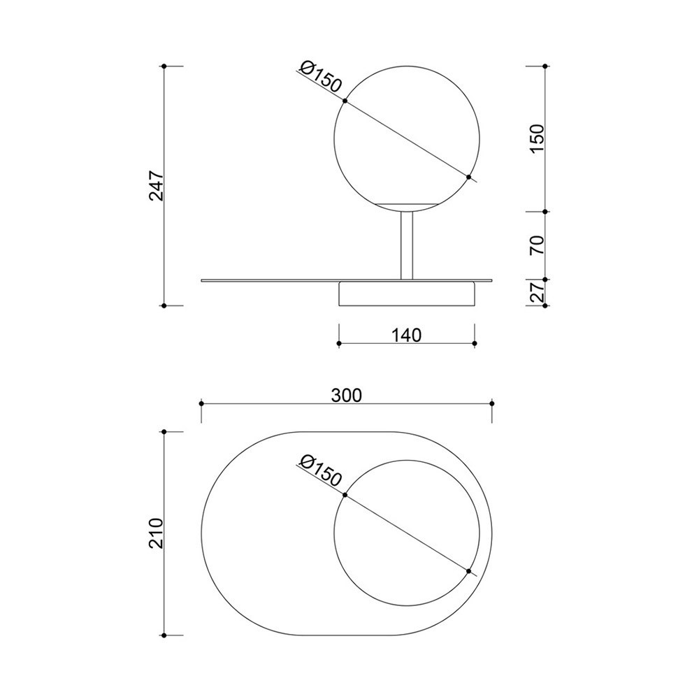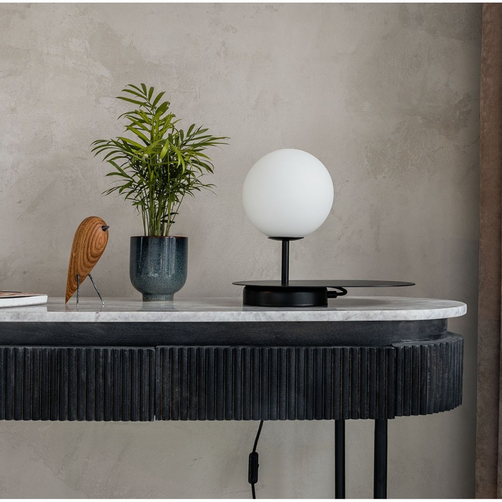 • lampa stołowa • metal / szkło • czarny • wysokość 25cm • szerokość 30cm • szklany klosz w kolorze białym matowym fi 15cm • podstawa w kolorze czarnym strukturalnym fi 14cm • metalowa czarna półka • przewód dwużyłowy 2 X 0.75mm2 w czarnym poliestrowym oplocie o długości 150cm • czarna wtyczka i przełącznik • gwint G9 • max 12W
