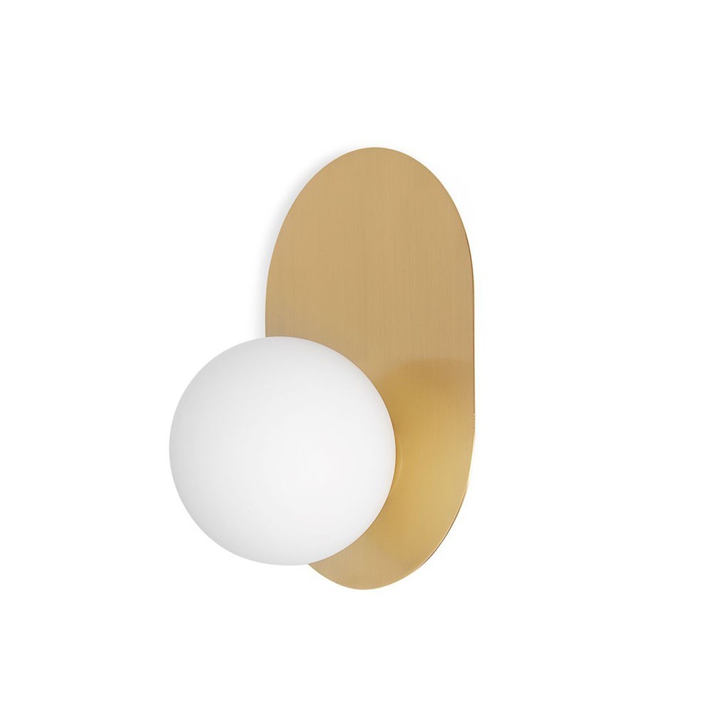 • lampa ścienna / kinkiet • mosiądz / metal / szkło • złoty / biały • wysokość 30cm • szerokość 21cm • głębokość 18cm • szklany klosz o średnicy 15cm w kolorze białym matowym • mocowanie ścienne lakierowana w kolorze złotym • przewód dwużyłowy 2 X 0.75mm2 • gwint G9 • max 12W