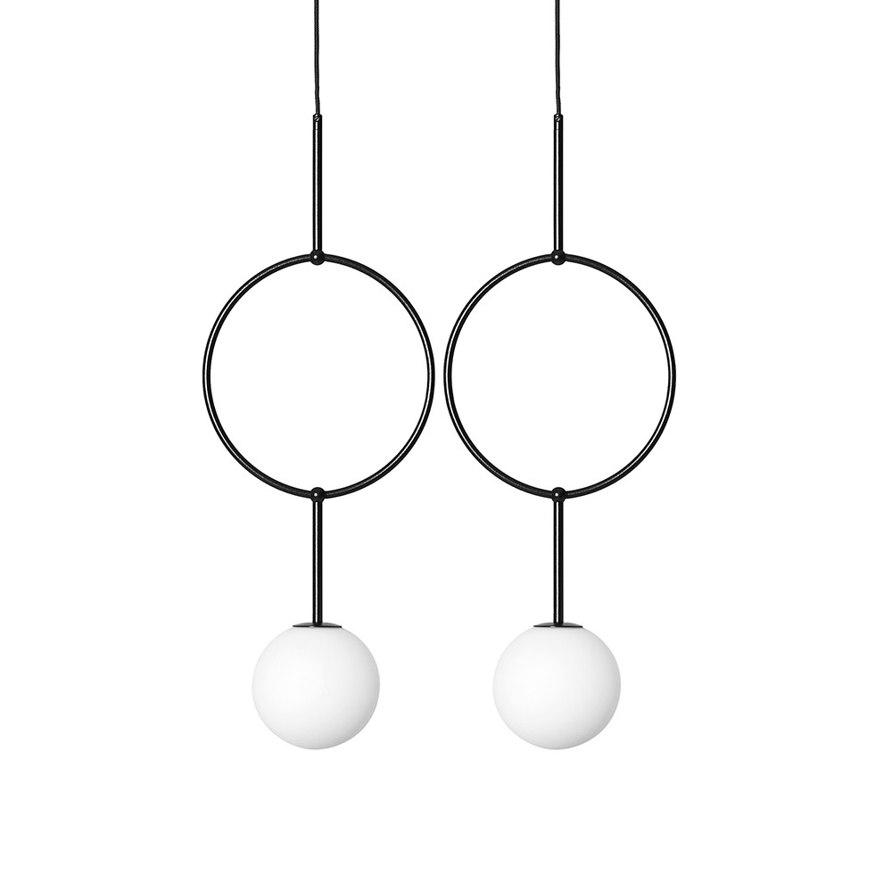 • lampa wisząca, lampa sufitowa • kolor czarny, biały • materiał wykonania metal, szkło • wysokość 160cm • szerokość 60cm • głębokość 15cm • 2x biały, szklany klosz ⌀15cm • 2x czarna rama z okrągłym pierścieniem • przewód w oplocie czarnym poliestrowym • czarna metalowa podsufitka 40cm • gwint G9 • max 12W • IP20