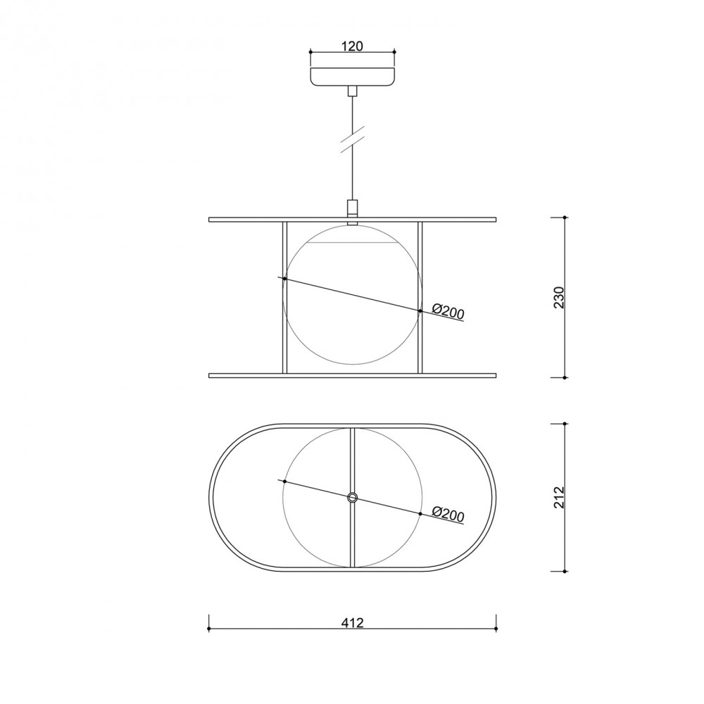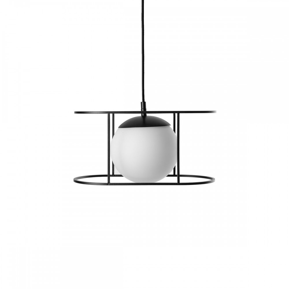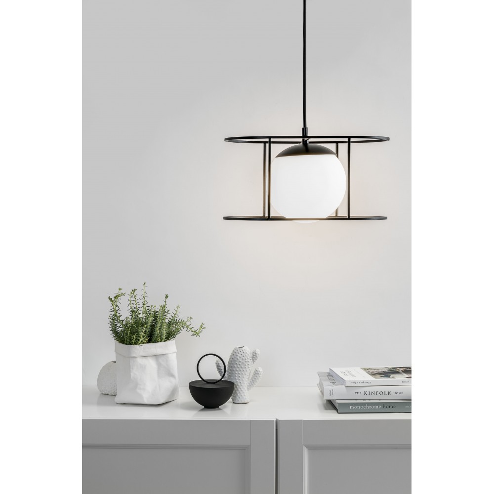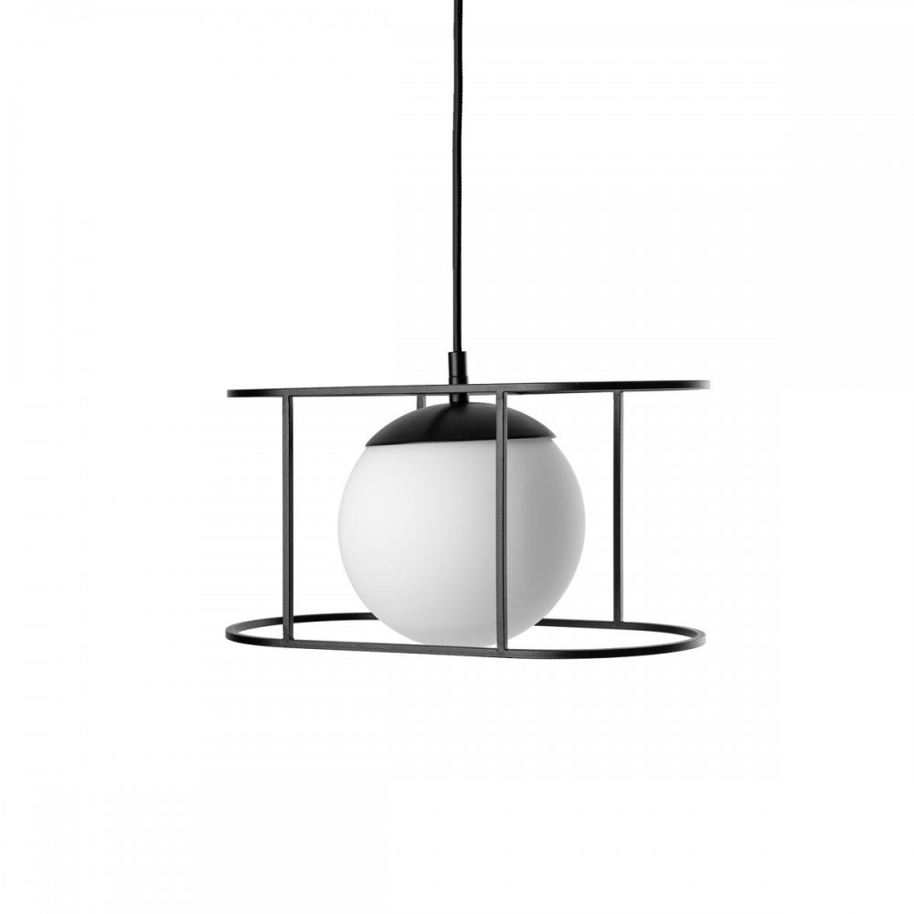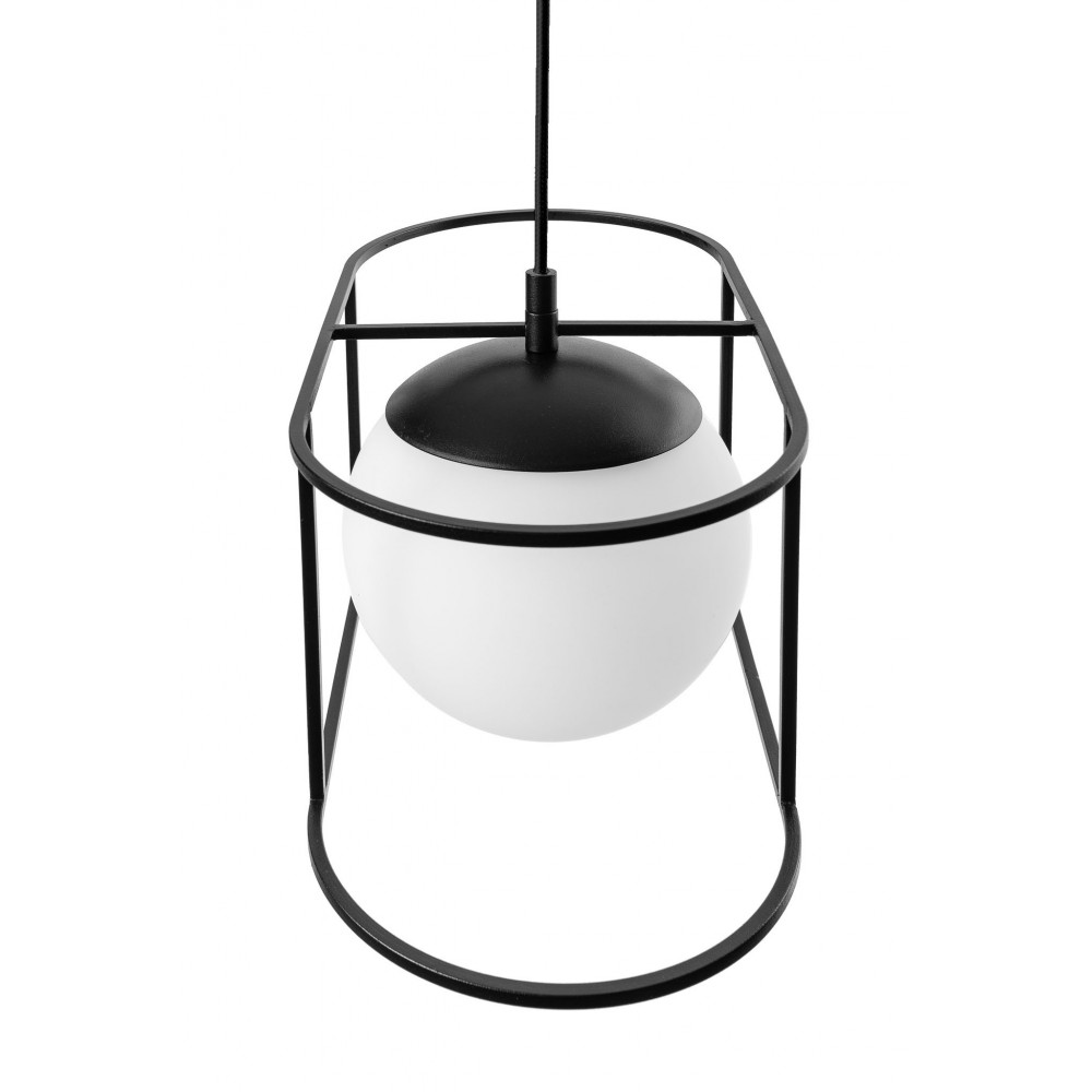 • lampa sufitowa, lampa wisząca • długość 123 cm • szklany klosz w kolorze białym matowym • metalowa rama i maskownica sufitowa lakierowana w kolorze czarnym strukturalnym • oplot czarny bawełniany • przewód dwużyłowy 2 X 0.75mm2 • max 15W