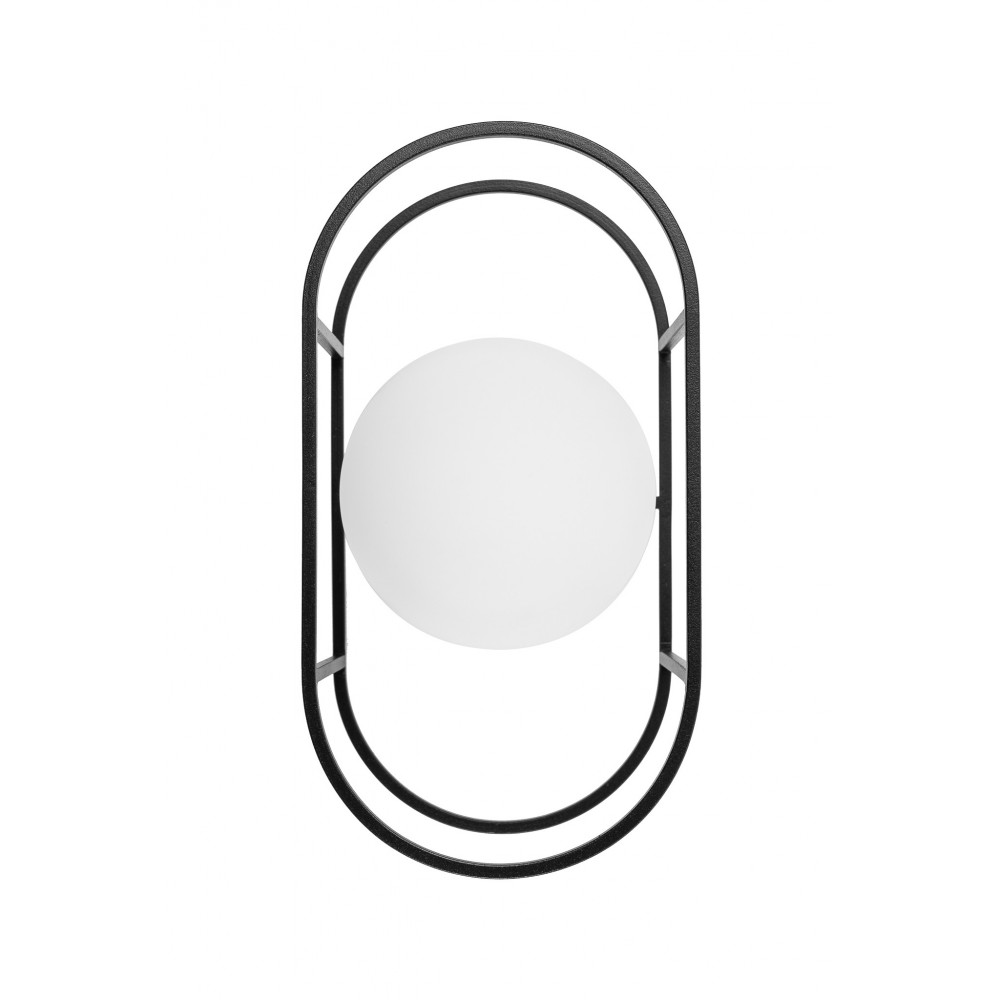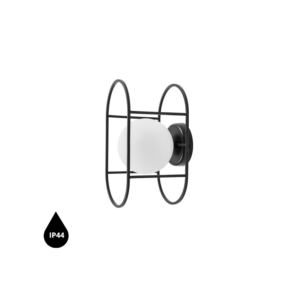 • lampa sufitowa, lampa ścienna, kinkiet • wysokość 33,2 cm • głębokość 16,6 cm • szklany klosz w kolorze białym matowym • metalowa rama i maskownica sufitowa lakierowana w kolorze czarnym strukturalnym • max 12W • IP44
