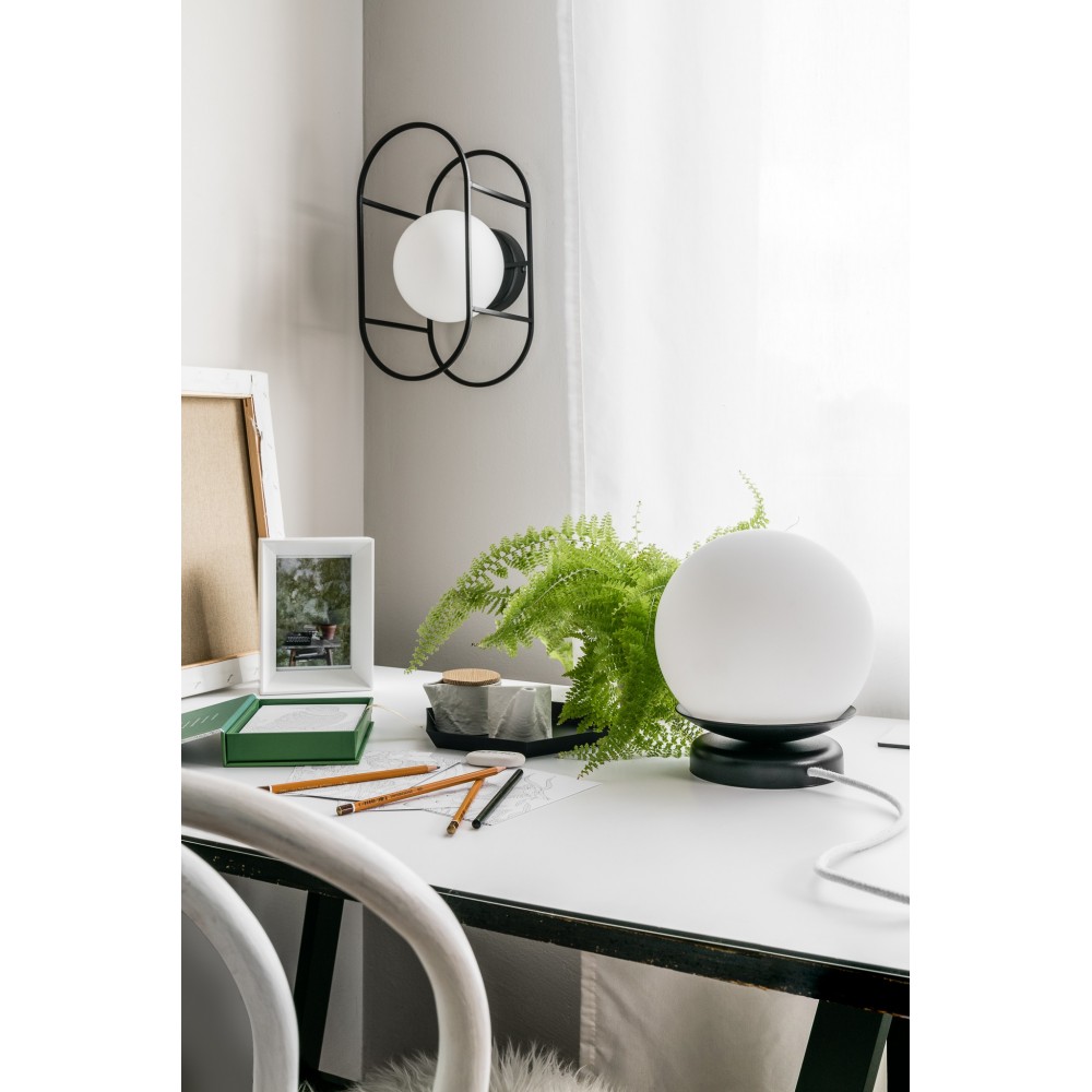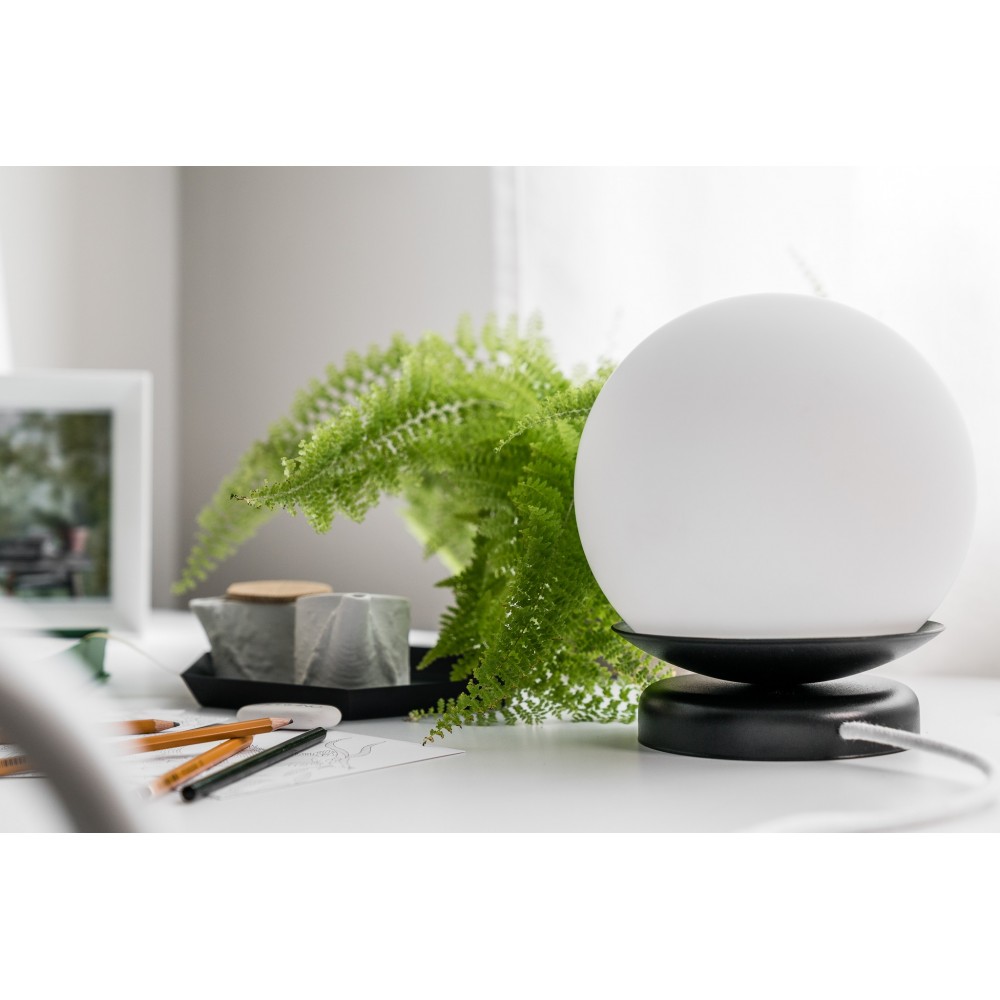 • lampa stołowa • kolor czarny (Jet Black RAL 9005) • materiał wykonania metal, szkło • długość 20cm • szerokość 20cm • wysokość 22,5cm • mlecznobiały szklany klosz ⌀20cm • podstawa lakierowana w kolorze czarnym strukturalnym • przewód w oplocie, czarnym, poliestrowym 150cm • czarna wtyczka i przełącznik • gwint E27 • max 15W LED • IP20