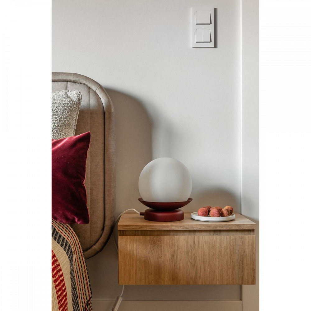 • lampa stołowa • kolor burgundowy (Purple Red RAL 3004) • materiał wykonania metal, szkło • długość 20cm • szerokość 20cm • wysokość 22,5cm • mlecznobiały szklany klosz ⌀20cm • podstawa lakierowana w kolorze burgundowym strukturalnym • przewód w oplocie, białym, poliestrowym 150cm • biała wtyczka i przełącznik • gwint E27 • max 15W LED • IP20