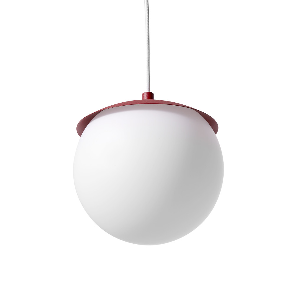 • lampa sufitowa, lampa wisząca • kolor burgundowy (Purple Red RAL 9003) • materiał wykonania metal, szkło • długość 20cm • szerokość 20cm • wysokość 20cm • długość całkowita 135cm • mlecznobiały szklany klosz ⌀20cm • mocowanie lakierowane w kolorze burgundowym strukturalnym • przewód w oplocie, białym, poliestrowym 112,5cm • gwint E27 • max 15W LED • IP44