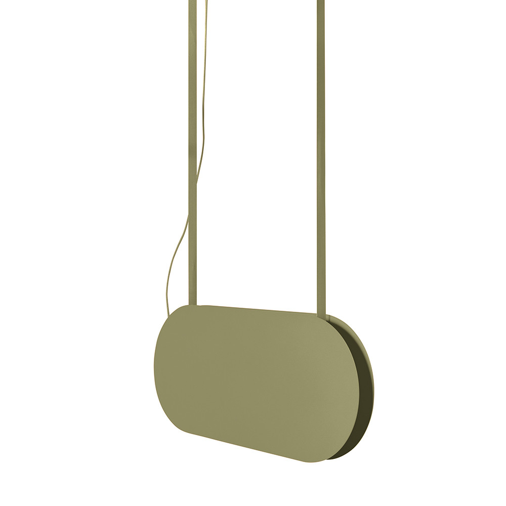 • lampa sufitowa, lampa wisząca • kolor oliwkowy (Reed Green RAL 6013) • materiał wykonania metal, aluminium • długość 80cm • szerokość 5,2cm • wysokość 35cm • długość całkowita 180cm • oliwkowy kabel w oplocie poliestrowym 145cm • 2x taśma materiałowa 145cm • oliwkowa, metalowa maskownica sufitowa 60,3cm • wbudowany LED • moc 24W • IP20