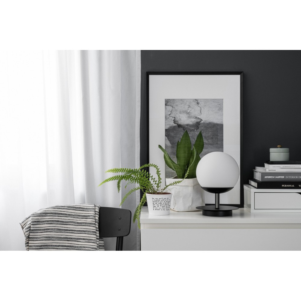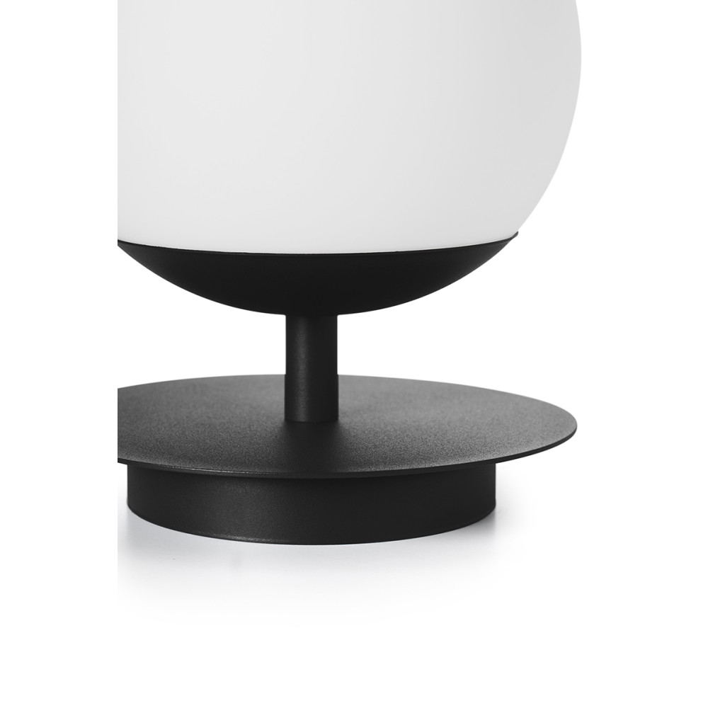 • lampa stołowa • metal / szkło • czarny / biały • wys. 27cm • średnica 20cm • szklany klosz w kolorze białym matowym fi 20cm • podstawa w kolorze czarnym strukturalnym fi 14cm • metalowy krążek fi 20cm • przewód dwużyłowy 2 X 0.75mm2 w czarnym oplocie o długości 150cm • czarna wtyczka i przełącznik • gwint E27 • max 15W