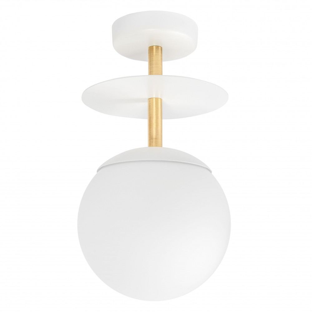 • lampa sufitowa, plafon • metal / mosiądz / szkło • biały / mosiądz / biały • wysokość 37cm • średnica 20cm • szklany klosz w kolorze białym matowym fi 20cm • maskownica sufitowa lakierowana w kolorze białym strukturalnym fi 12cm • metalowy krążek fi 20cm • przewód dwużyłowy 2 X 0.75mm2 • gwint E27 • max 15W
