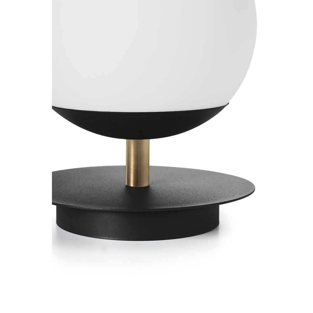 • lampa stołowa • metal /mosiądz / szkło • czarny / biały • wys. 27cm • średnica 20cm • szklany klosz w kolorze białym matowym fi 20cm • podstawa w kolorze czarnym strukturalnym • metalowy krążek fi 20cm • przewód dwużyłowy 2 X 0.75mm2 w czarnym oplocie o długości 150cm • czarna wtyczka i przełącznik • gwint E27 • max 15W