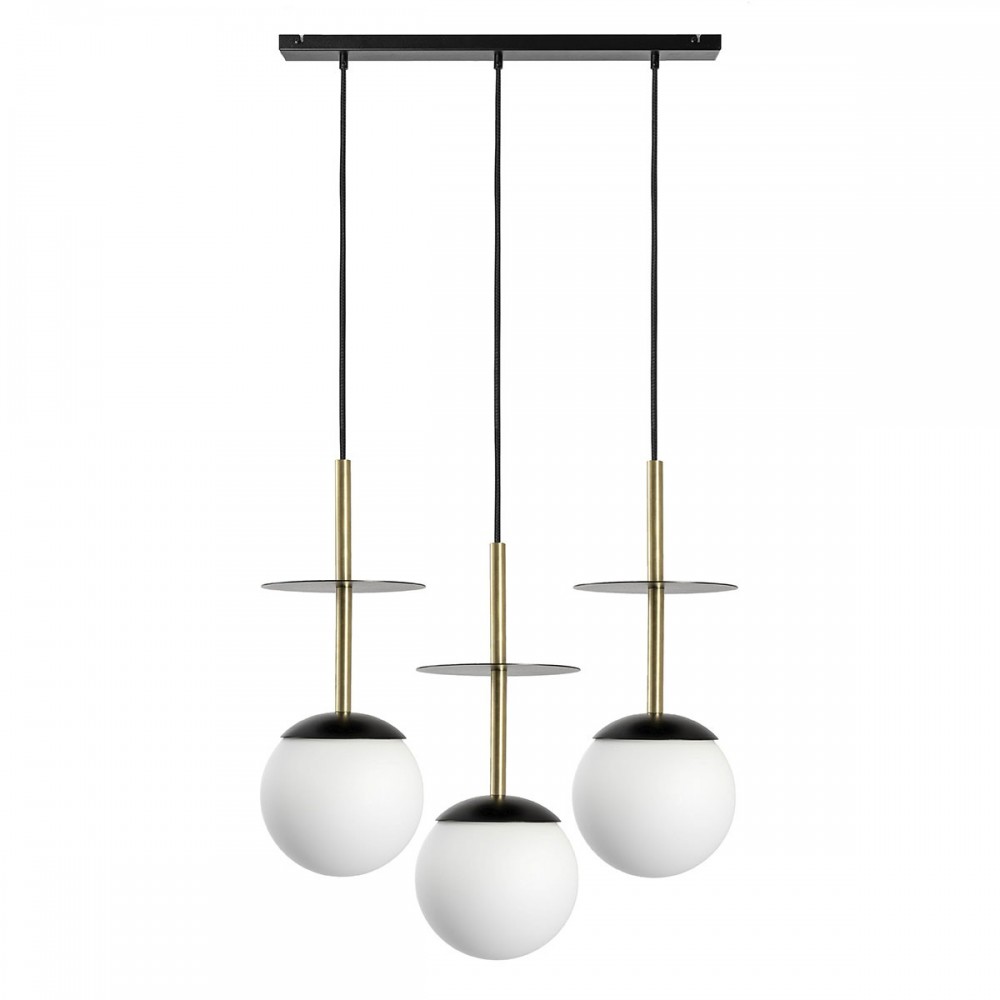 • potrójna lampa sufitowa wisząca • metal / szkło • czarny / mosiądz • długość 130cm • długość przewodu 70cm, 80cm, 70cm • szklany klosz w kolorze białym matowym fi 20cm • listwa sufitowa lakierowana w kolorze czarnym strukturalnym 60cm • trzy metalowe krążki fi 20cm • przewód dwużyłowy 2 X 0.75mm2 w oplocie czarnym poliestrowym • gwint E27 • max 3x15W