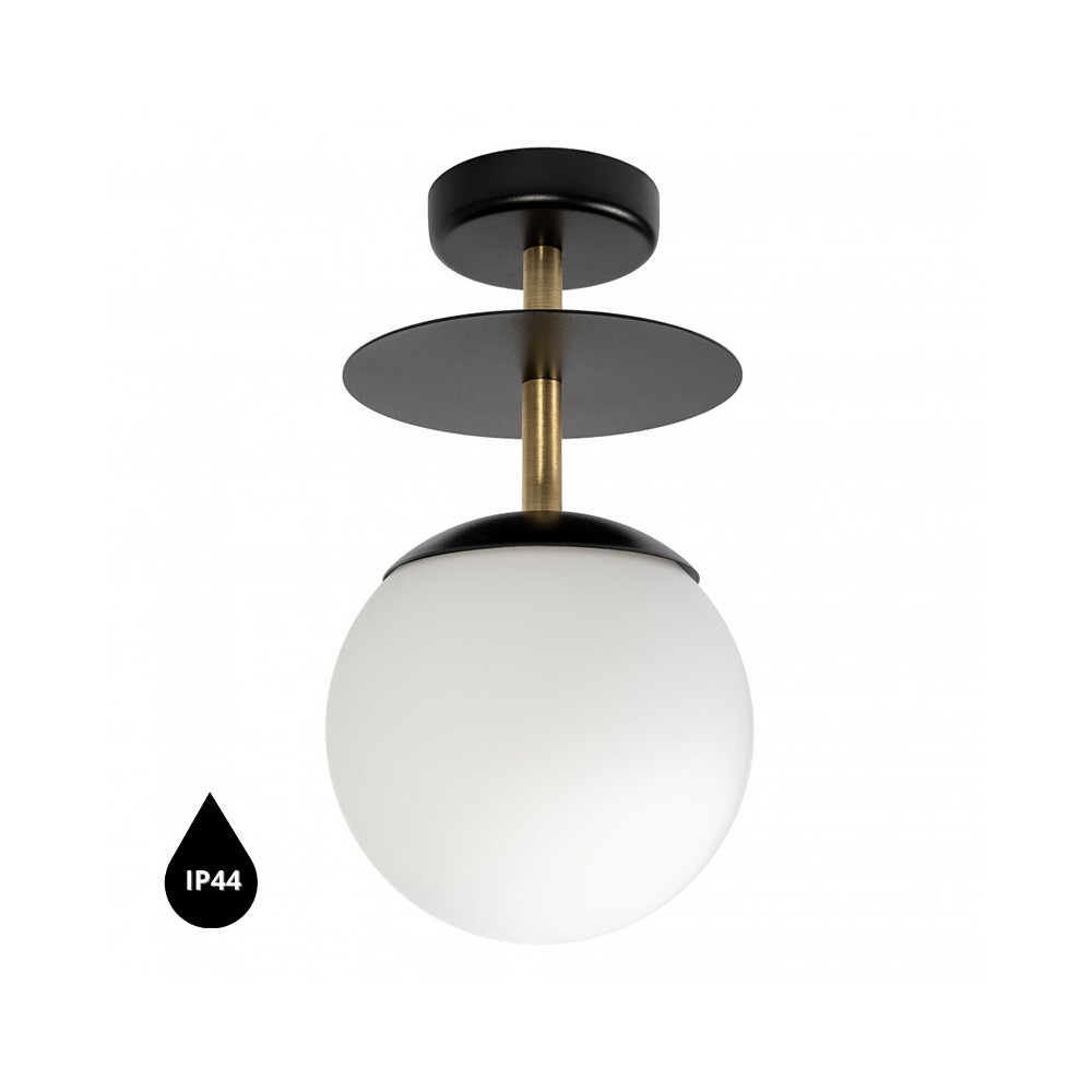 • lampa sufitowa, plafon • metal / mosiądz / szkło • czarny / mosiądz / biały • wysokość 37cm • średnica 20cm • szklany klosz w kolorze białym matowym fi 20cm • maskownica sufitowa lakierowana w kolorze czarnym strukturalnym fi 12cm • metalowy krążek fi 20cm • przewód dwużyłowy 2 X 0.75mm2 • gwint E27 • max 15W • IP44