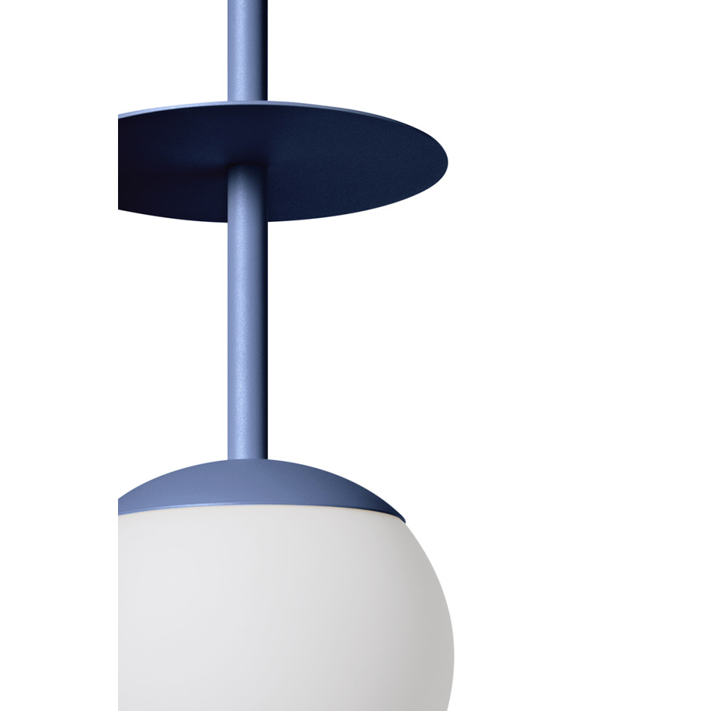 • lampa sufitowa, lampa wisząca • materiał wykonania metal, szkło • kolor niebieski gołębi (Pigeon Blue RAL 5014) • długość 160cm • długość przewodu 110cm • szklany klosz w kolorze białym matowym fi 20cm • maskownica lakierowana w kolorze niebieskim strukturalnym fi 12cm • metalowy krążek fi 20cm • przewód dwużyłowy 2 X 0.75mm2 w oplocie niebieskim poliestrowym • gwint E27 • max 15W • IP20
