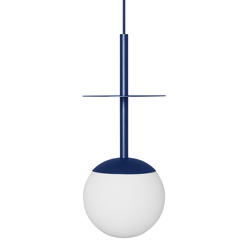 • lampa sufitowa, lampa wisząca • materiał wykonania metal, szkło • kolor granatowy (Sapphire Blue RAL 5003) • długość 160cm • długość przewodu 110cm • szklany klosz w kolorze białym matowym fi 20cm • maskownica sufitowa lakierowana w kolorze granatowym strukturalnym fi 12cm • metalowy krążek fi 20cm • przewód dwużyłowy 2 X 0.75mm2 w oplocie granatowym poliestrowym • gwint E27 • max 15W • IP20