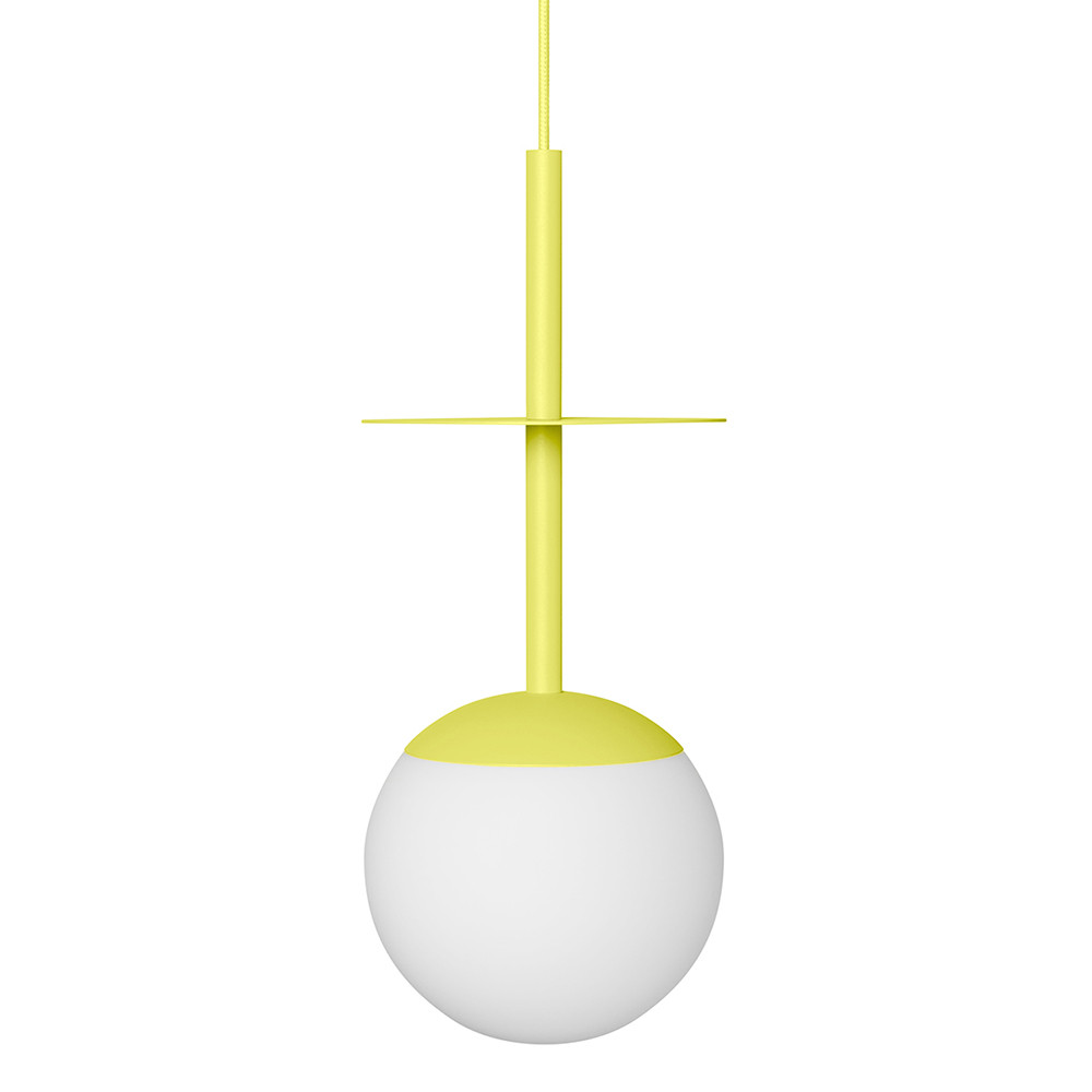 • lampa sufitowa, lampa wisząca • materiał wykonania metal, szkło • kolor żółty (Sulfur Yellow RAL 1016) • długość 160cm • długość przewodu 110cm • szklany klosz w kolorze białym matowym fi 20cm • maskownica sufitowa lakierowana w kolorze żółtym strukturalnym fi 12cm • metalowy krążek fi 20cm • przewód dwużyłowy 2 X 0.75mm2 w oplocie żółtym poliestrowym • gwint E27 • max 15W • IP20