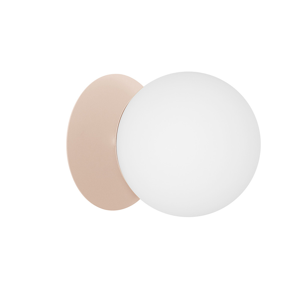• lampa ścienna, kinkiet, plafon • materiał wykonania metal, szkło • kolor beżowy (Soft Peach) • długość 26,6cm • szerokość 20cm • wysokość 20cm • szklany klosz w kolorze białym matowym fi 20cm • mocowanie ścienne lakierowane w kolorze beżowym strukturalnym fi 14cm • metalowy krążek fi 20cm • przewód dwużyłowy 2 X 0.75mm2 • gwint E27 • max 15W • IP44