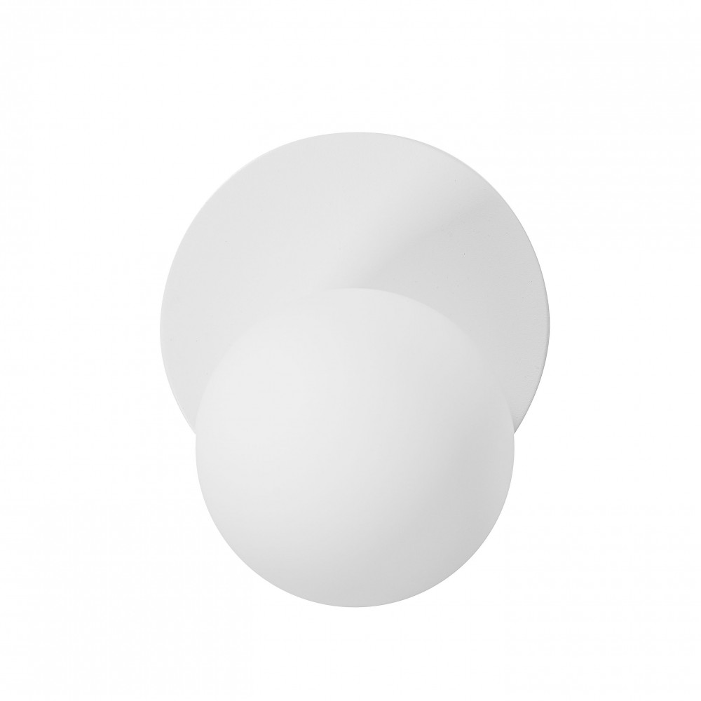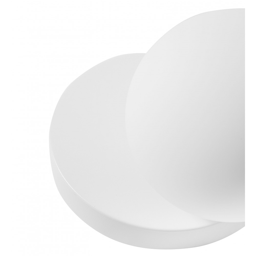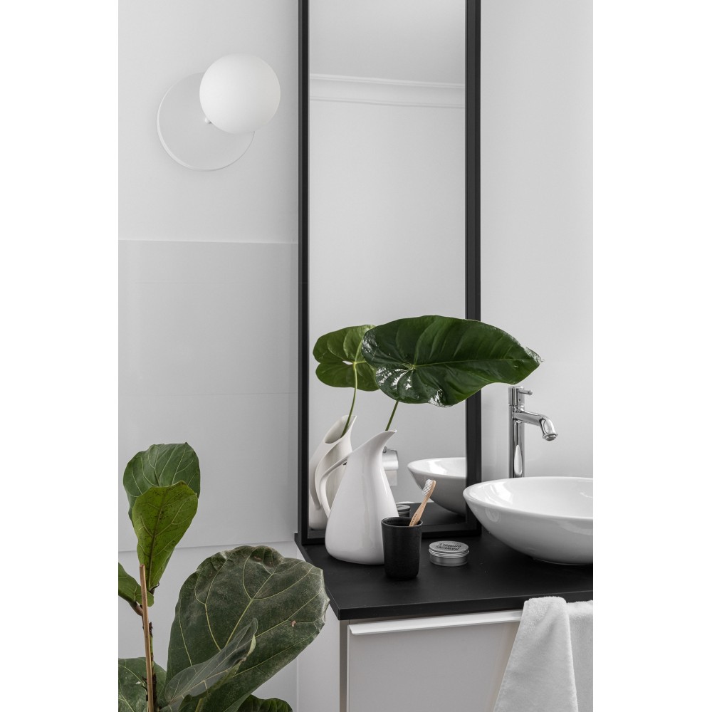 • lampa ścienna, kinkiet • metal / szkło • biały • wysokość 24cm • szerokość 20cm • głębokość 18cm • szklany klosz o średnicy 15cm w kolorze białym matowym • mocowanie ścienne lakierowana w kolorze białym strukturalnym • przewód dwużyłowy 2 X 0.75mm2 • gwint G9 • max. 12W • IP44