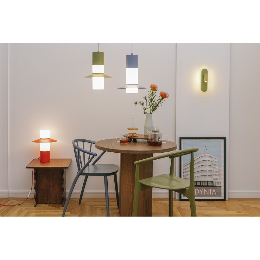 Korpus wykonano z metalu malowanego proszkowo w kolorach: oliwkowym RAL 6013, białym RAL 9003 lub czarnym RAL 9005, co podkreśla jej minimalistyczną, ale nowoczesną formę. Na froncie zastosowano strukturalne szkło – transparentne, ale ryflowane, które wprowadza do wnętrza światło o subtelnie rozproszonym charakterze.