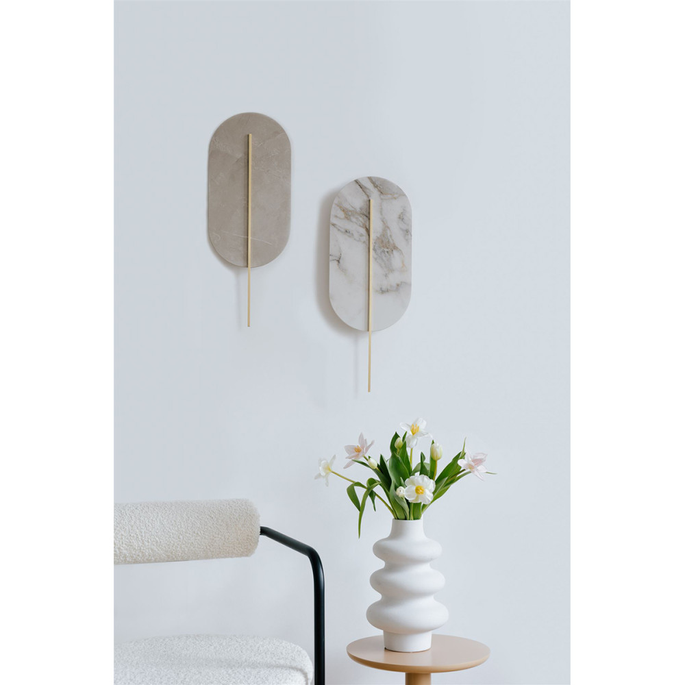 • lampa ścienna, kinkiet • kolor gresu biały (Ballet) • kolor pręta do wyboru: biały, czarny, melon, mosiądz • materiał wykonania metal, mosiądz, gres szkliwiony • długość 3,8cm • szerokość 21cm • wysokość 56,6cm • klosz z mosiężnym elementem (mocowany za pomocą magnesów do maskownicy ściennej) • biała metalowa maskownica 8x8cm • gwint 2xG9 • max 2x12W • IP20