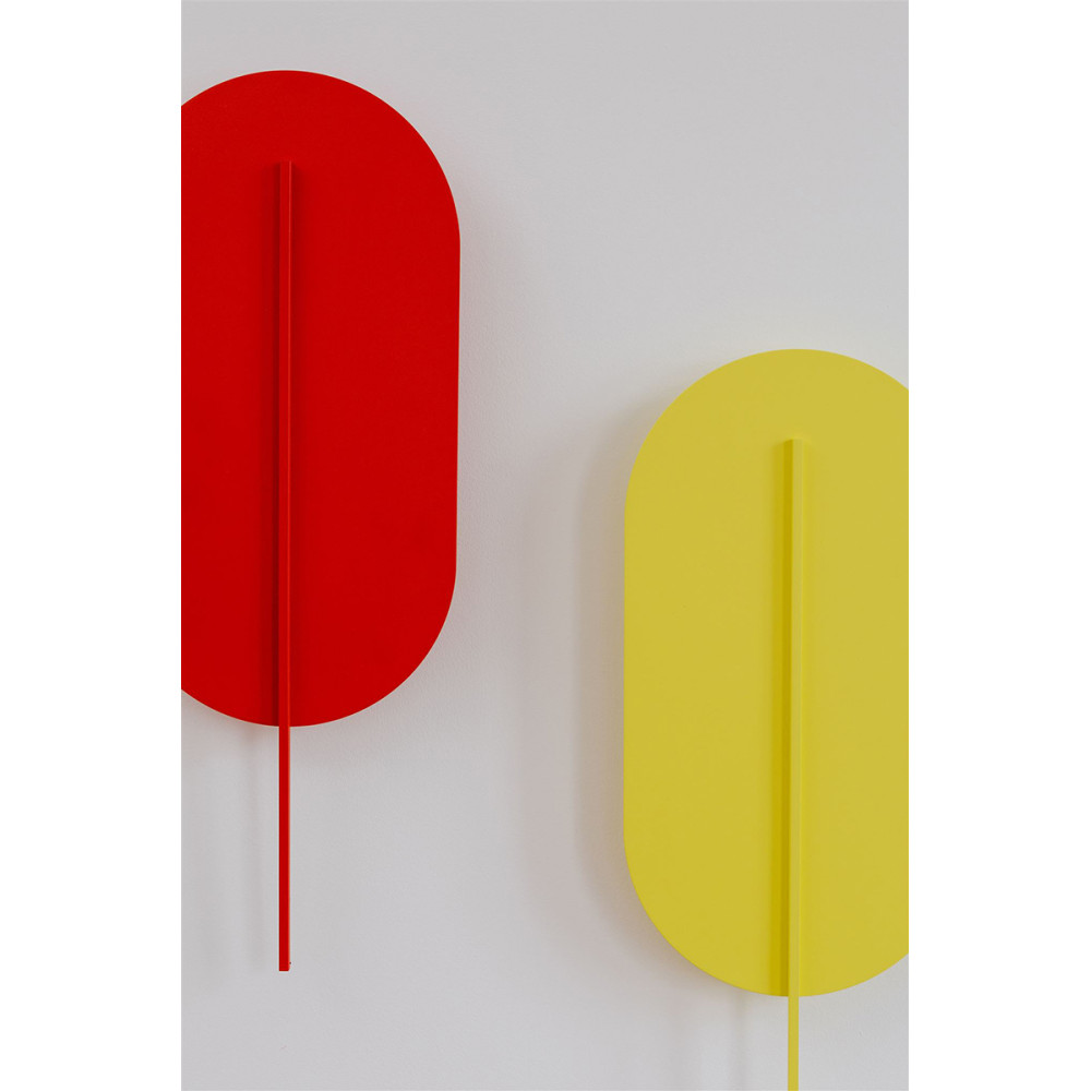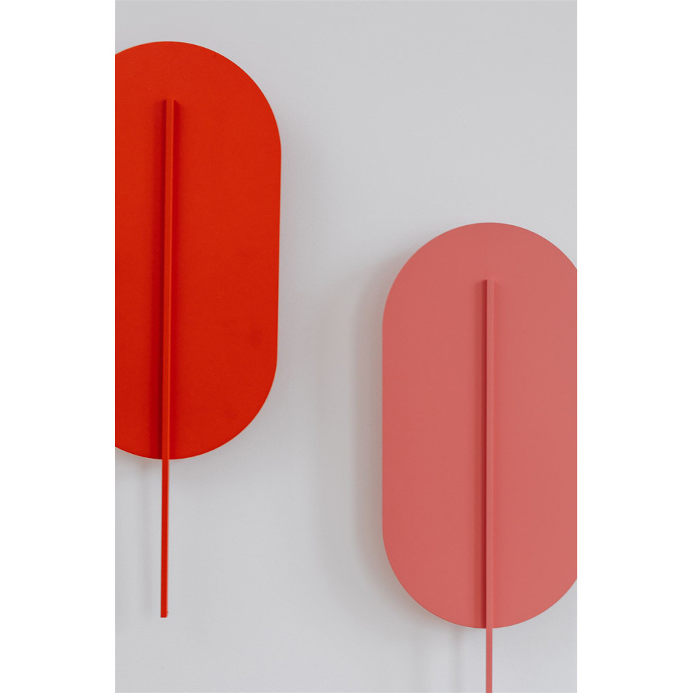 • lampa ścienna, kinkiet • kolor czerwonopomarańczowy (Vermilion RAL 2002) • materiał wykonania metal, mosiądz • długość 3,8cm • szerokość 21cm • wysokość 56,6cm • czerwonopomarańczowy klosz z dekoracyjnym elementem (mocowany za pomocą magnesów do maskownicy ściennej) • biała metalowa maskownica 8x8cm • gwint 2xG9 • max 2x12W • IP20