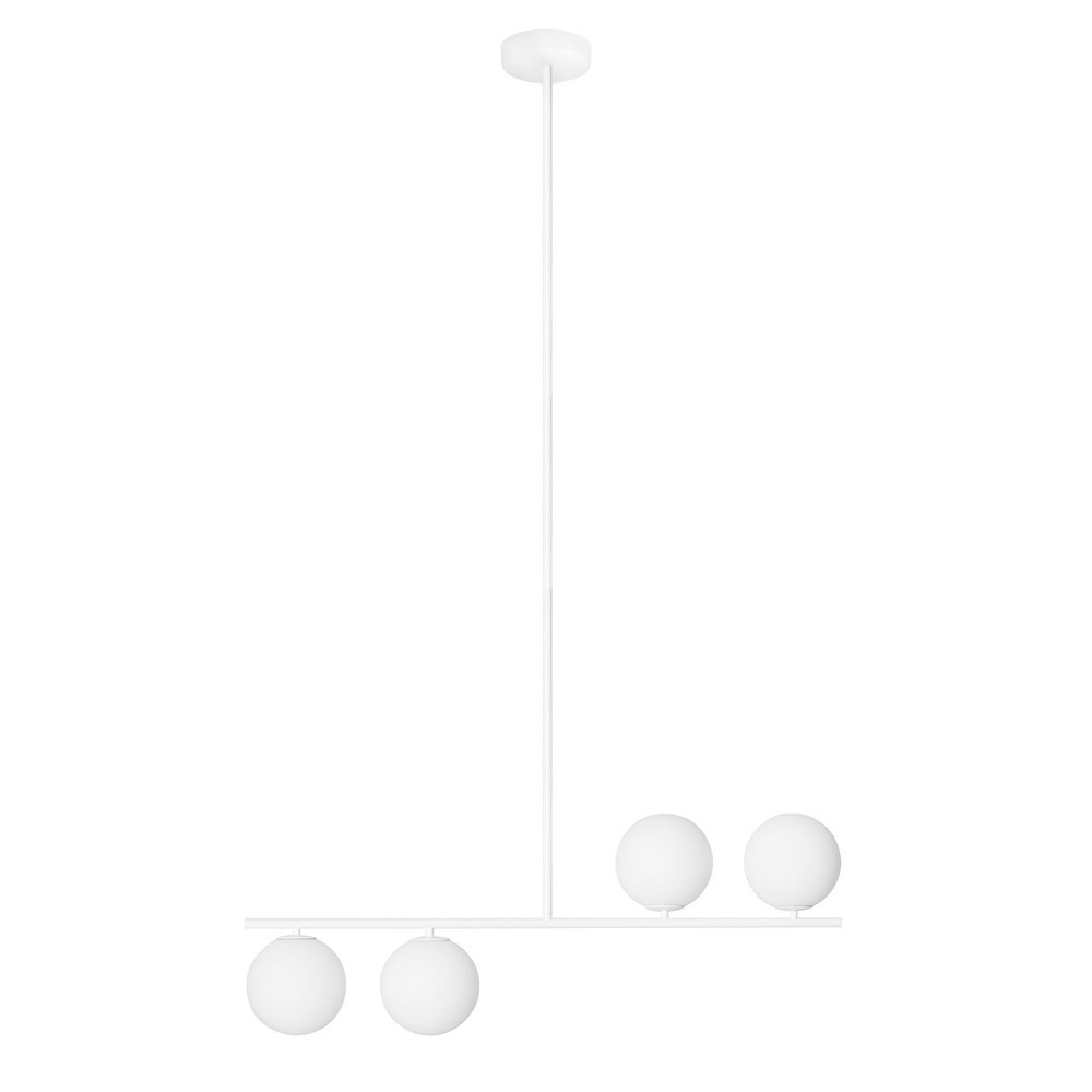• lampa wisząca, lampa sufitowa • rozmiar XL • kolor biały • materiał wykonania metal, szkło • wysokość 142cm • szerokość 90cm • głębokość 15cm • 4x biały, szklany klosz ⌀15cm • biały metalowy stelaż (wysokość 120cm, szerokość 90cm) • biała maskownica ⌀12cm • gwint G9 • max 4x12W • IP20