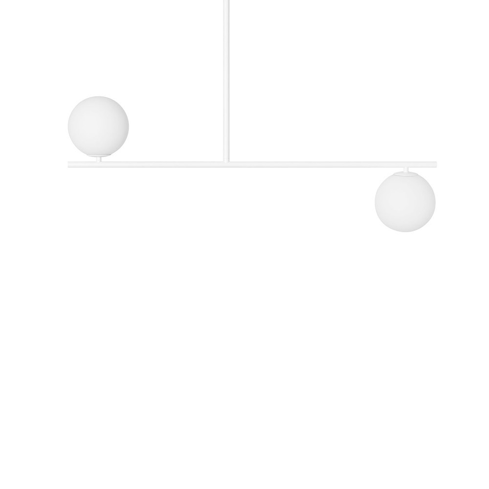 • lampa wisząca, lampa sufitowa • rozmiar M • kolor biały • materiał wykonania metal, szkło • wysokość 82cm • szerokość 90cm • głębokość 15cm • 2x biały, szklany klosz ⌀15cm • biały metalowy stelaż (wysokość 60cm, szerokość 90cm) • biała maskownica ⌀12cm • gwint G9 • max 2x12W • IP20