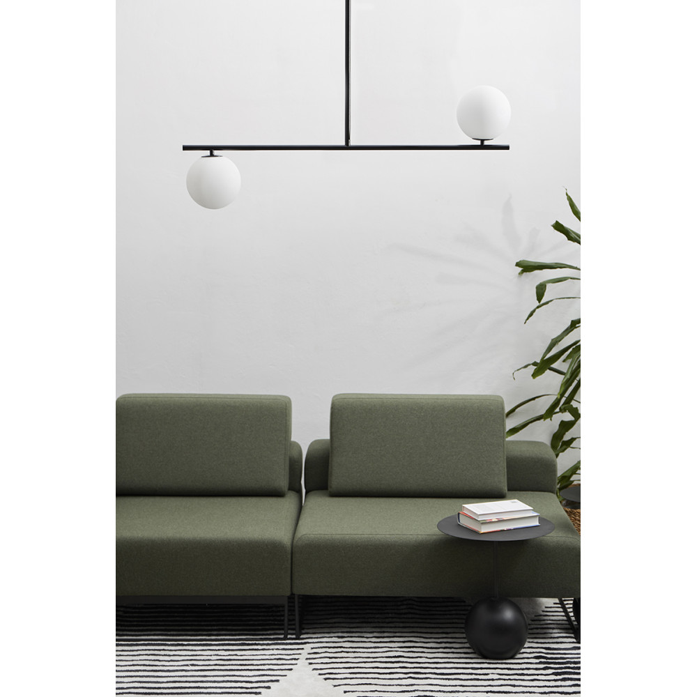 • lampa wisząca, lampa sufitowa • rozmiar M • kolor czarny, biały • materiał wykonania metal, szkło • wysokość 82cm • szerokość 90cm • głębokość 15cm • 2x biały, szklany klosz ⌀15cm • czarny metalowy stelaż (wysokość 60cm, szerokość 90cm) • czarna maskownica ⌀12cm • gwint G9 • max 2x12W • IP20