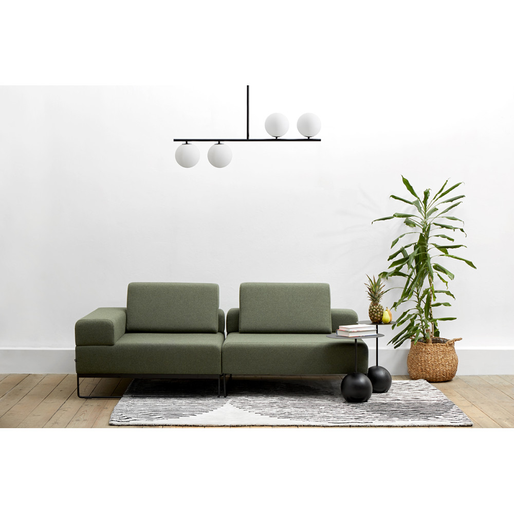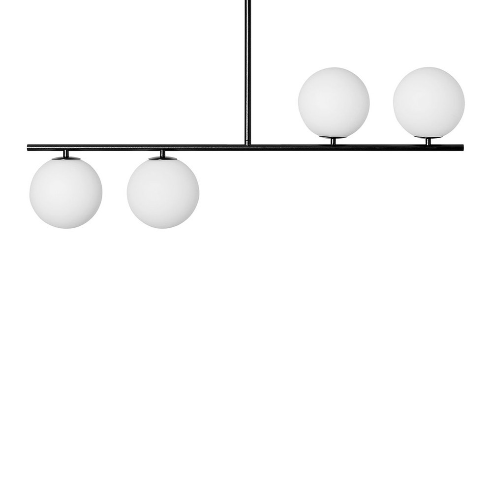 • lampa wisząca, lampa sufitowa • rozmiar S • kolor czarny, biały • materiał wykonania metal, szkło • wysokość 52cm • szerokość 90cm • głębokość 15cm • 4x biały, szklany klosz ⌀15cm • czarny metalowy stelaż (wysokość 30cm, szerokość 90cm) • czarna maskownica ⌀12cm • gwint G9 • max 4x12W • IP44