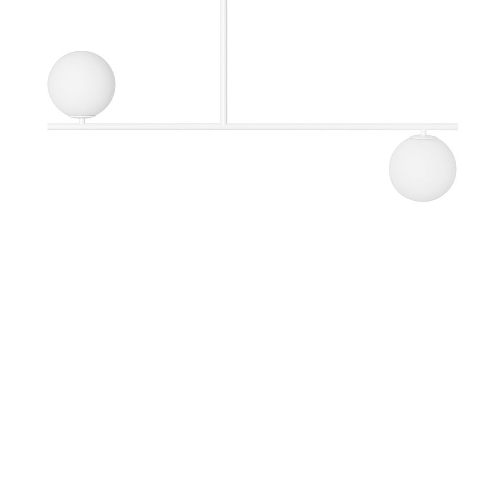 • lampa wisząca, lampa sufitowa • rozmiar S • kolor biały • materiał wykonania metal, szkło • wysokość 52cm • szerokość 90cm • głębokość 15cm • 2x biały, szklany klosz ⌀15cm • biały metalowy stelaż (wysokość 30cm, szerokość 90cm) • biała maskownica ⌀12cm • gwint G9 • max 2x12W • IP44