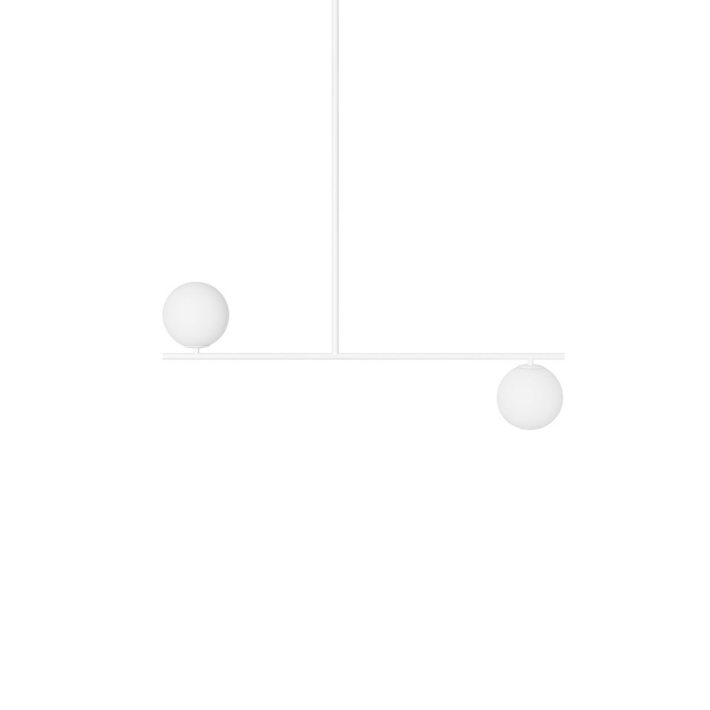 • lampa wisząca, lampa sufitowa • rozmiar XL • kolor biały • materiał wykonania metal, szkło • wysokość 142cm • szerokość 90cm • głębokość 15cm • 2x biały, szklany klosz ⌀15cm • biały metalowy stelaż (wysokość 120cm, szerokość 90cm) • biała maskownica ⌀12cm • gwint G9 • max 2x12W • IP44