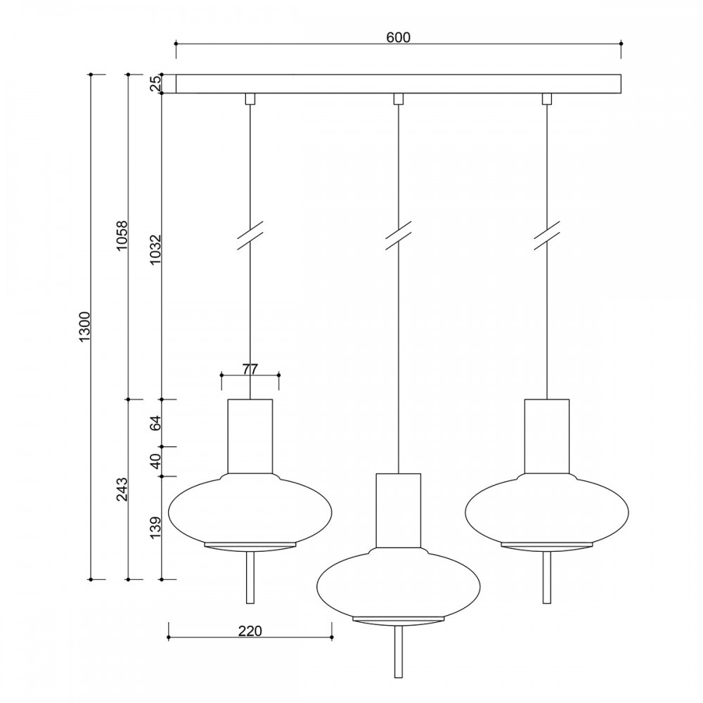 • lampa sufitowa, lampa wisząca • metal / szkło • biały • długość całkowita 130cm • szerokość 60cm • 3x szklany klosz w kolorze białym matowym fi 22cm • listwa sufitowa lakierowana w kolorze białym strukturalnym 60cm • przewód dwużyłowy 2 X 0.75mm2 w białym poliestrowym oplocie o długości 103cm, 113cm, 103cm • gwint E27 • max 3x15W